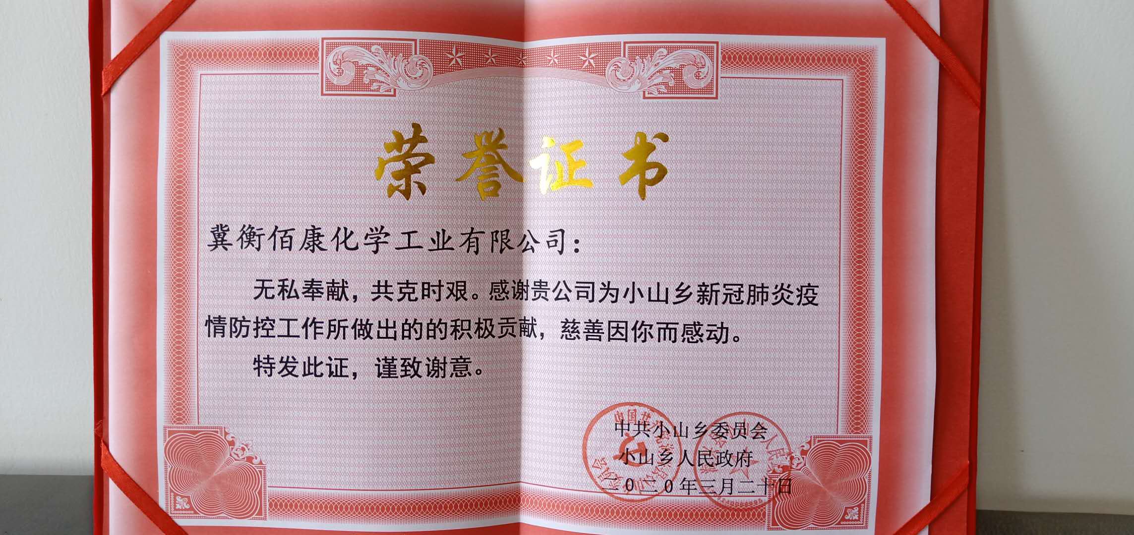 近日,海興縣小山鄉(xiāng)黨委、鄉(xiāng)政府為感謝佰康公司在疫情防控期間,積極為小山鄉(xiāng)防疫捐贈消毒用品頒發(fā)榮譽證書,佰康公司表示,作為一家海興縣的企業(yè),盡自己最大的努力協(xié)助當(dāng)?shù)乜箵粢咔?,是企業(yè)義不容辭的責(zé)任,今后佰康公司將堅持疫情防控和安全生產(chǎn)兩手抓、兩手硬的要求,確保實現(xiàn)疫情防控和安全生產(chǎn)的雙勝利,為海興縣地方發(fā)展作出應(yīng)有的貢獻!